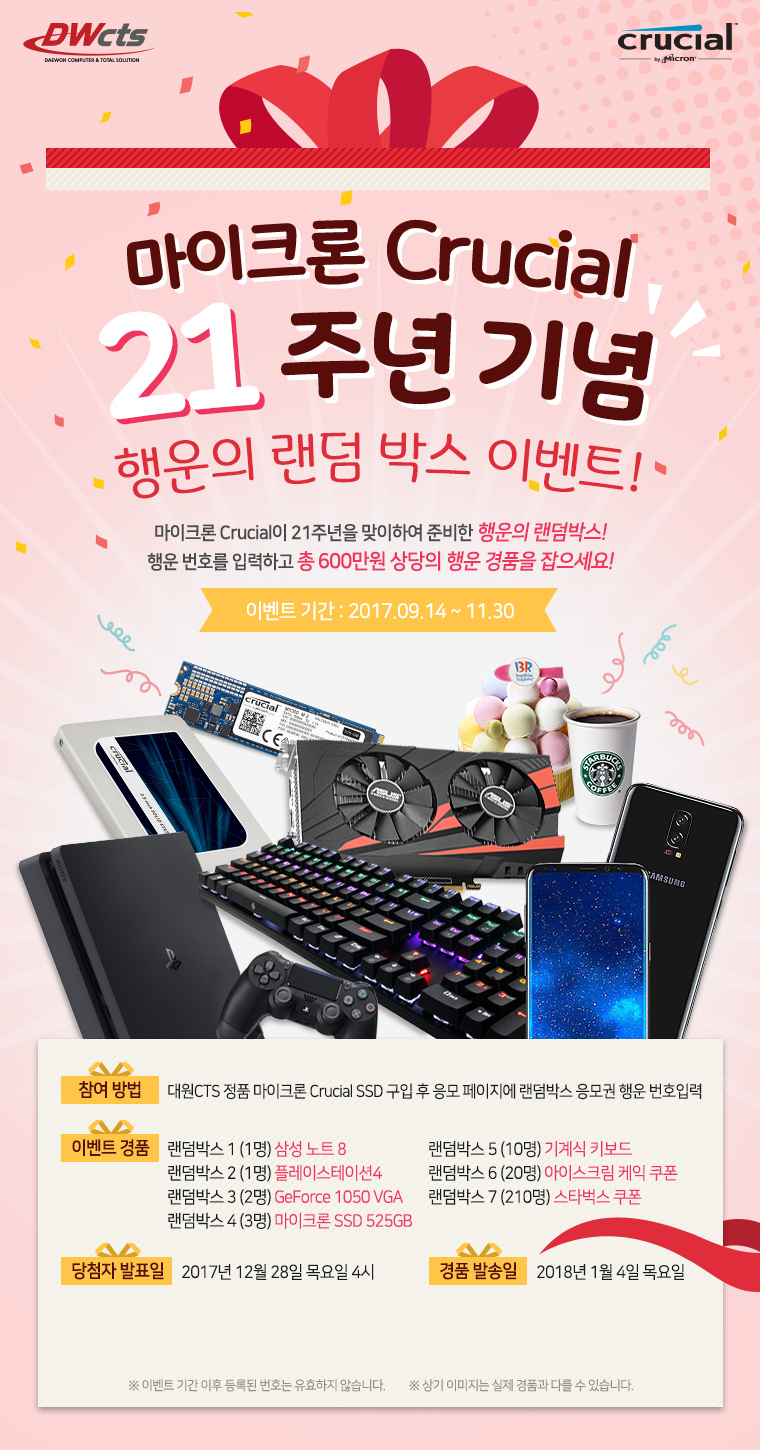 진행되는 이번 행사는 마이크론의 크루셜 브랜드 런칭 21주년을 기념하여 진행하는 행사로, 국내 공식 유통사인 대원 CTS 정품 SSD 구매자를 대상으로 마이크론 크루셜 1TB SSD를 시작으로