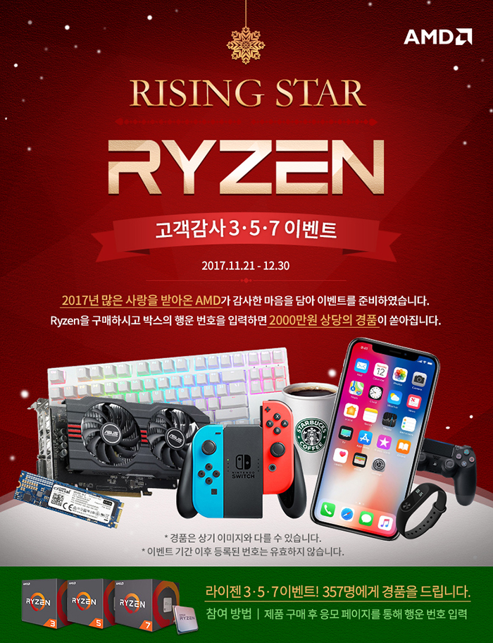 보답하고자 ‘라이징 스타, 라이젠 357’ 프로모션을 진행하며 해당 프로모션은 대원 CTS 정품 AMD 프로세서를 구매시 박스에 부착된 대원 CTS 프로모션 쿠폰을