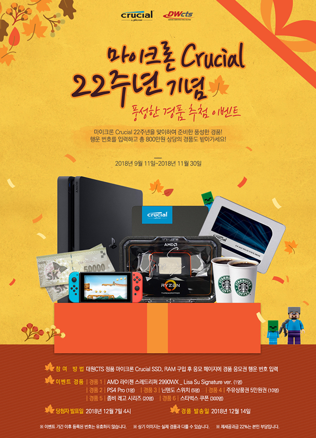 마이크론 크루셜 22주년 기념 추첨 이벤트는 해당 행사 기간 동안 제품을 구매하는 고객을 대상으로 진행되며 주의해야 할 점은
