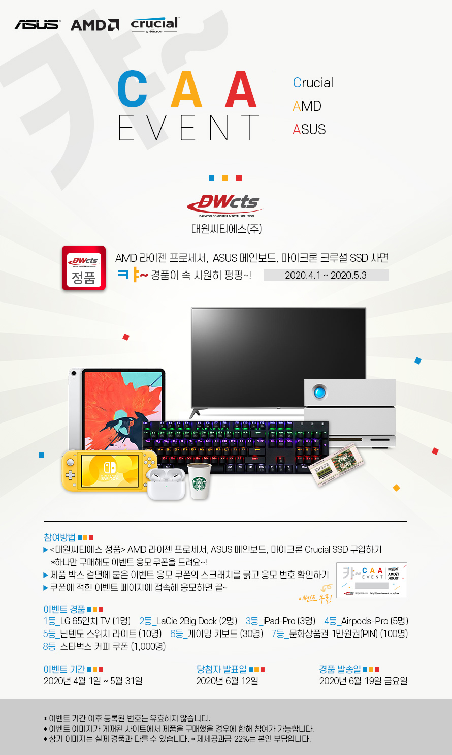 - 대원CTS 정품 마이크론 크루셜 SSD, AMD 라이젠 프로세서, ASUS 메인보드 구매 시 응모
